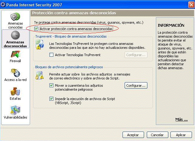 Deberá “Desactivar” la opción “Activar protección contra amenazas desconocidas”, para ello haga clic sobre dicha opción hasta que el visto desaparezca. La pantalla deberá quedar de la siguiente manera: